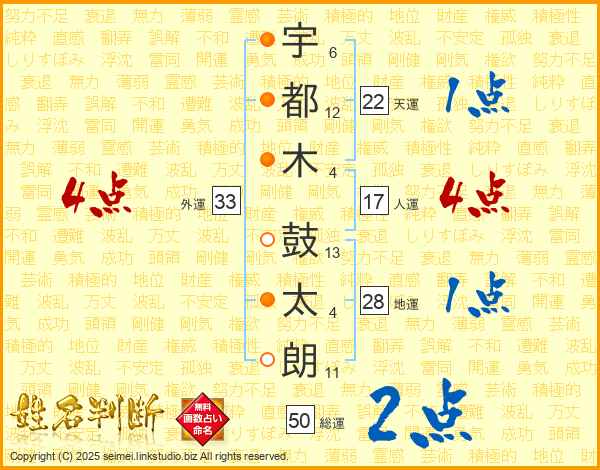宇(6画)都(12画)木(4画) 鼓(13画)太(4画)朗(11画)