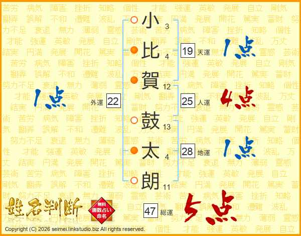 小(3画)比(4画)賀(12画) 鼓(13画)太(4画)朗(11画)