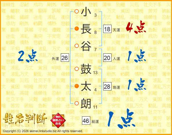 小長谷鼓太朗さんの総運は46画の1点!