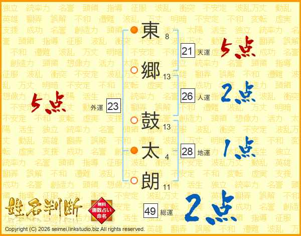 東(8画)郷(13画) 鼓(13画)太(4画)朗(11画)