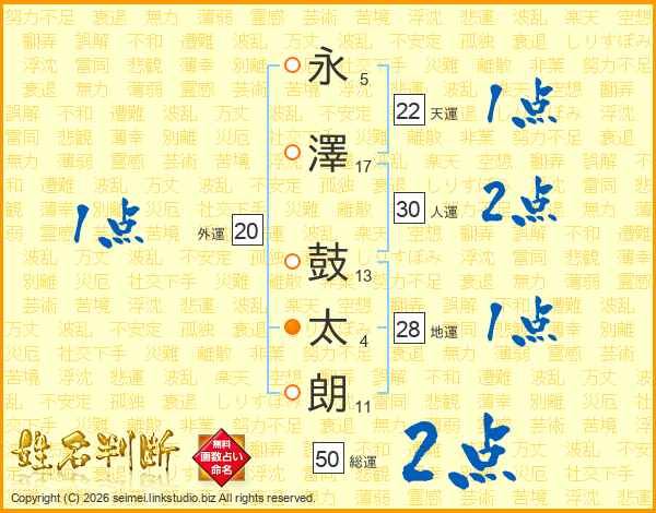 永(5画)澤(17画) 鼓(13画)太(4画)朗(11画)
