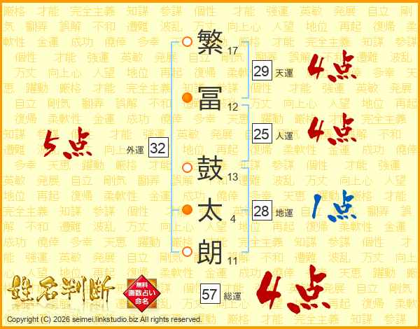 繁(17画)冨(12画) 鼓(13画)太(4画)朗(11画)
