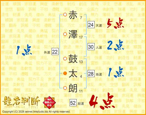 赤(7画)澤(17画) 鼓(13画)太(4画)朗(11画)