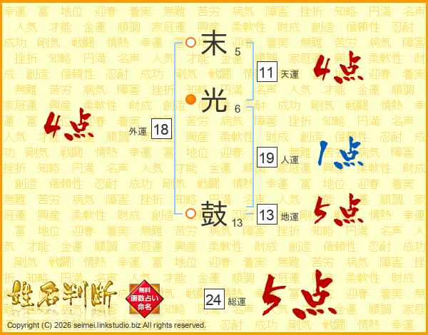 生活面を象徴する運勢です。外部から受ける影響力を表し、結婚運、家庭運や職場、環境への順応性を表します。総運から人運を引いた画数。姓や名が1文字の場合を除く。
