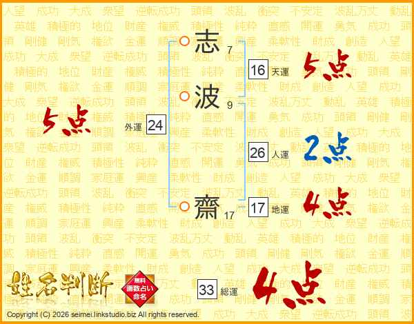 志波齋さんの総運は33画の4点!
