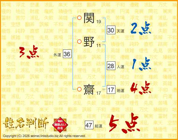 関野齋さんの総運は47画の5点!