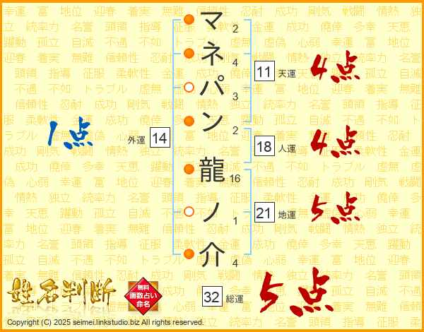 マ(2画)ネ(4画)パ(3画)ン(2画) 龍(16画)ノ(1画)介(4画)