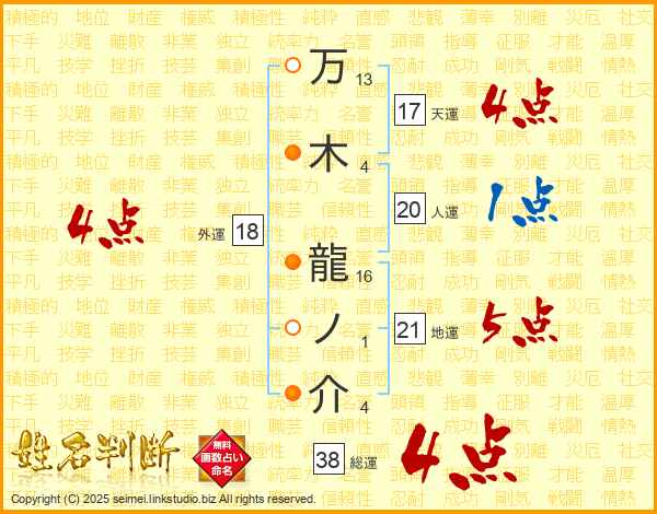 万(13画)木(4画) 龍(16画)ノ(1画)介(4画)