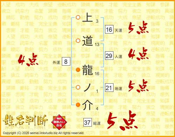 上(3画)道(13画) 龍(16画)ノ(1画)介(4画)