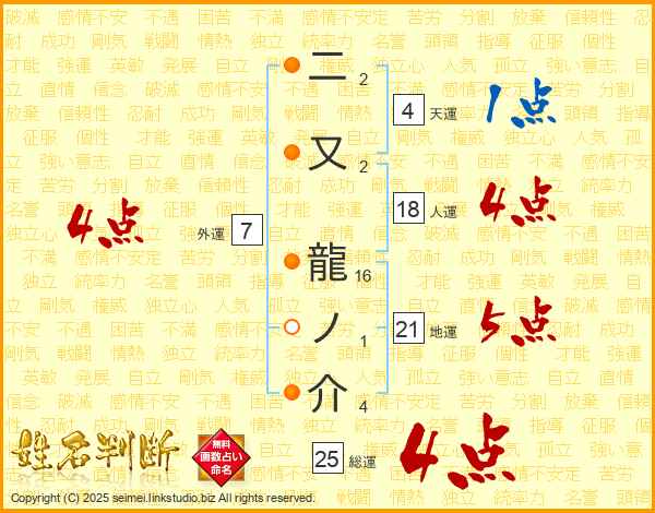 二又龍ノ介さんの総運は25画の4点!
