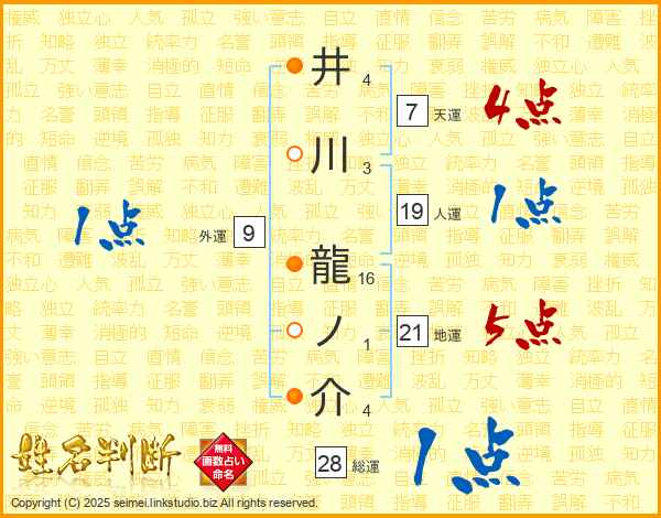 井(4画)川(3画) 龍(16画)ノ(1画)介(4画)