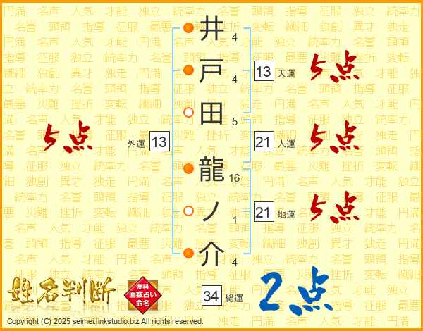 井(4画)戸(4画)田(5画) 龍(16画)ノ(1画)介(4画)