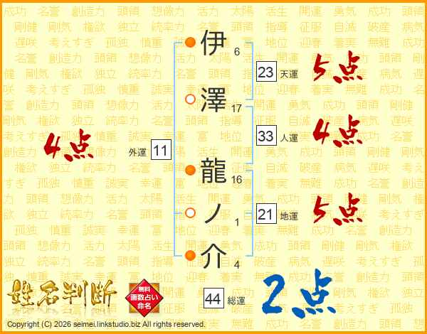 伊(6画)澤(17画) 龍(16画)ノ(1画)介(4画)