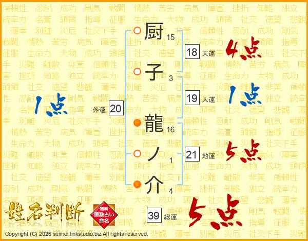生活面を象徴する運勢です。外部から受ける影響力を表し、結婚運、家庭運や職場、環境への順応性を表します。総運から人運を引いた画数。姓や名が1文字の場合を除く。
