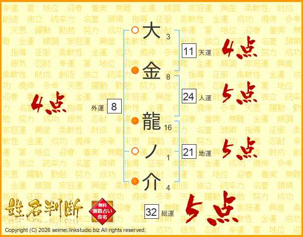 大(3画)金(8画) 龍(16画)ノ(1画)介(4画)