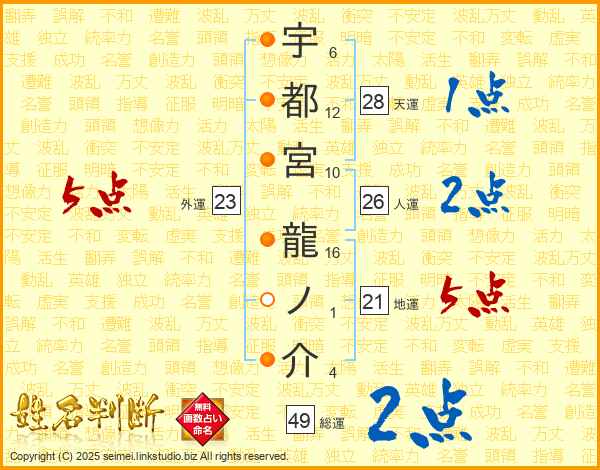 宇都宮龍ノ介さんの総運は49画の2点!