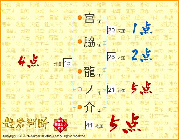 宮脇龍ノ介さんの総運は41画の5点!