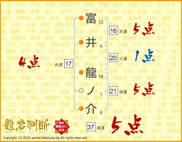 富(12画)井(4画) 龍(16画)ノ(1画)介(4画)