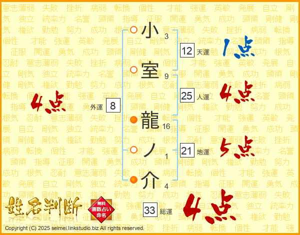 小(3画)室(9画) 龍(16画)ノ(1画)介(4画)