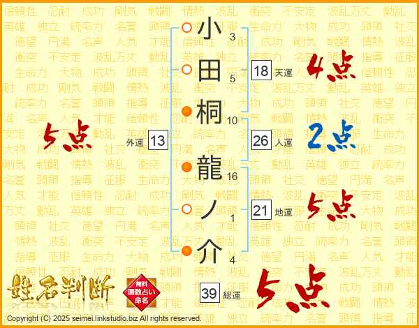 小田桐龍ノ介さんの総運は39画の5点!