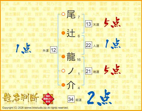 尾(7画)辻(6画) 龍(16画)ノ(1画)介(4画)