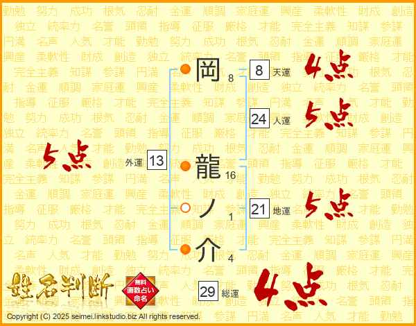 岡龍ノ介さんの総運は29画の4点!