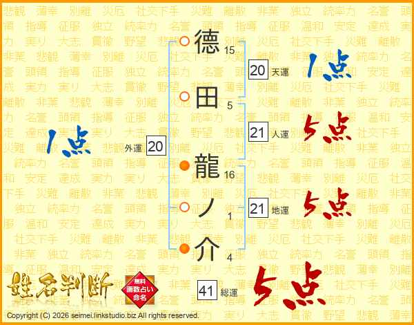 德(15画)田(5画) 龍(16画)ノ(1画)介(4画)