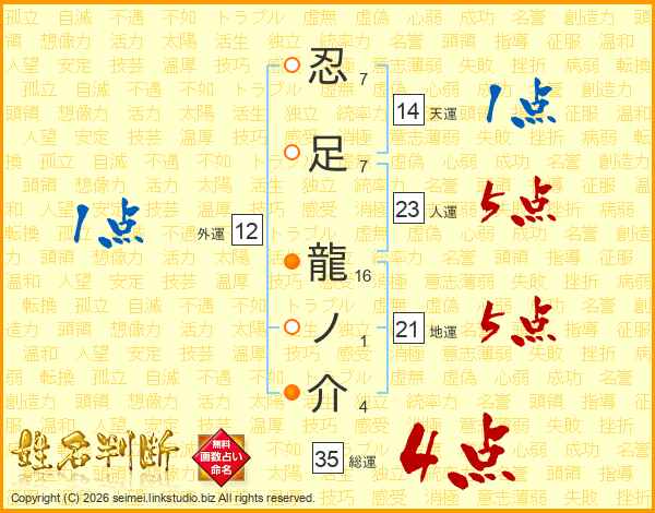 忍足龍ノ介さんの総運は35画の4点!