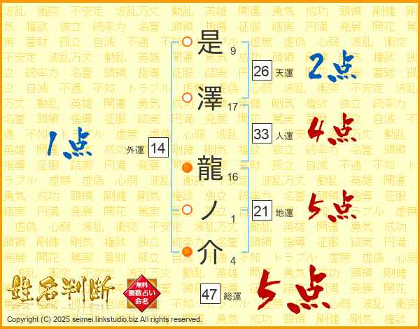 是(9画)澤(17画) 龍(16画)ノ(1画)介(4画)