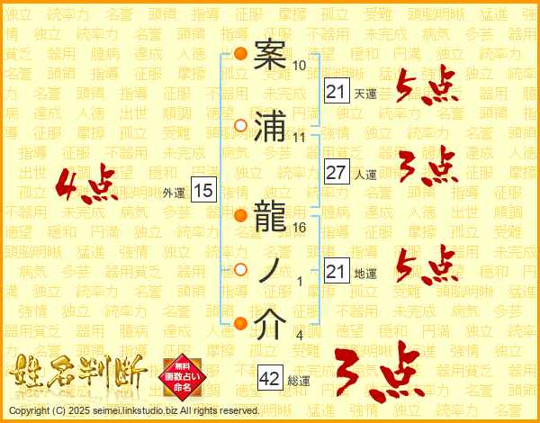 案(10画)浦(11画) 龍(16画)ノ(1画)介(4画)
