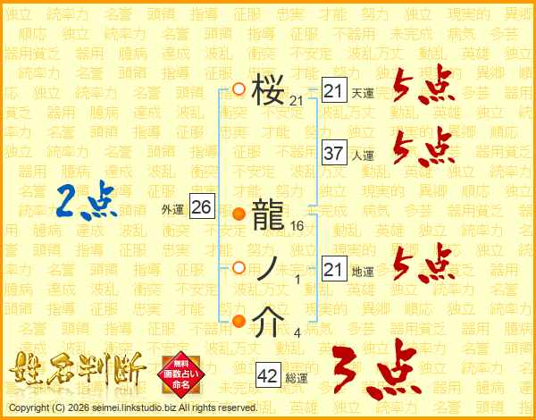 桜(21画) 龍(16画)ノ(1画)介(4画)