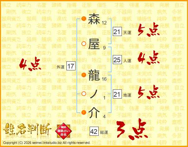 森(12画)屋(9画) 龍(16画)ノ(1画)介(4画)