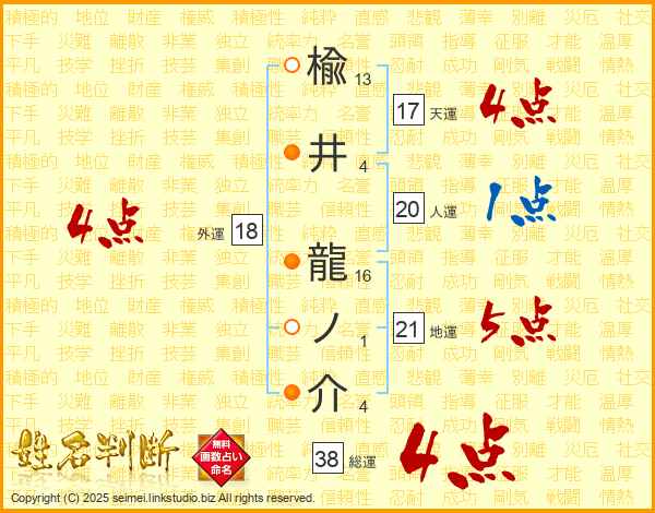 楡井龍ノ介さんの外運は18画の4点!