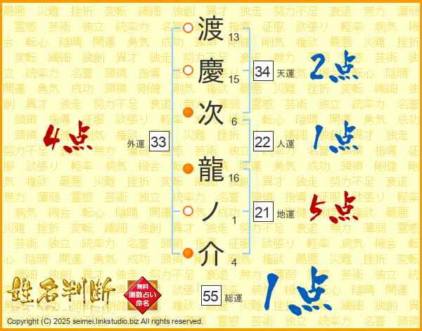 渡慶次龍ノ介さんの地運は21画の5点!