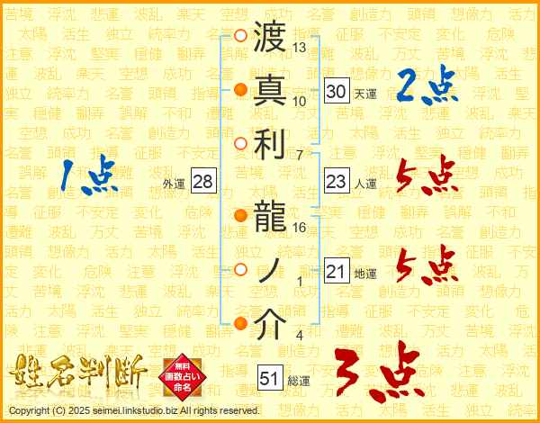 渡(13画)真(10画)利(7画) 龍(16画)ノ(1画)介(4画)