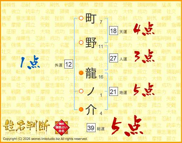 町(7画)野(11画) 龍(16画)ノ(1画)介(4画)