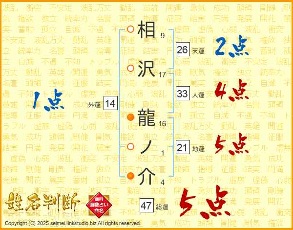 相(9画)沢(17画) 龍(16画)ノ(1画)介(4画)