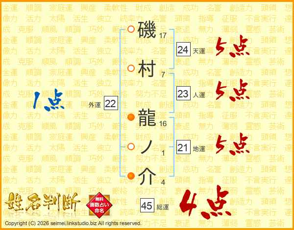 磯村龍ノ介さんの総運は45画の4点!