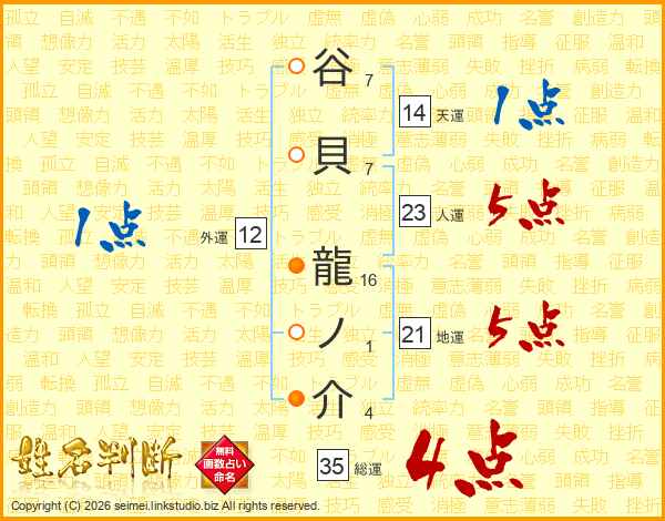 谷(7画)貝(7画) 龍(16画)ノ(1画)介(4画)