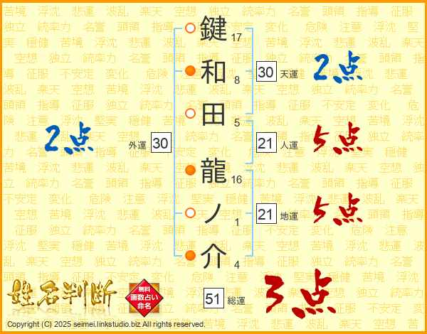 鍵(17画)和(8画)田(5画) 龍(16画)ノ(1画)介(4画)
