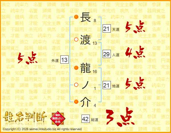 長(8画)渡(13画) 龍(16画)ノ(1画)介(4画)