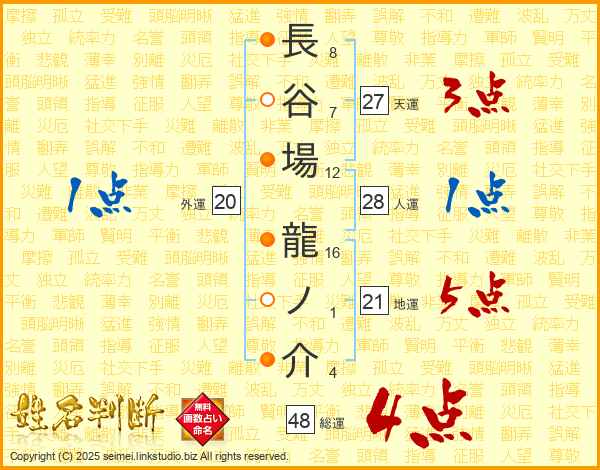 長(8画)谷(7画)場(12画) 龍(16画)ノ(1画)介(4画)