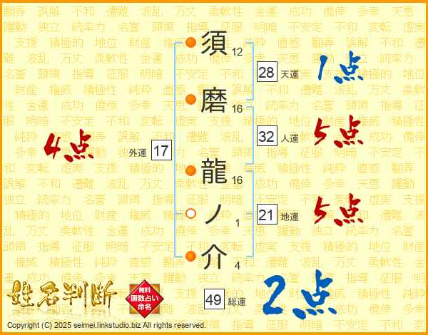 須(12画)磨(16画) 龍(16画)ノ(1画)介(4画)