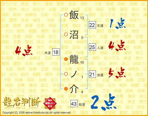飯沼龍ノ介さんの総運は43画の2点!