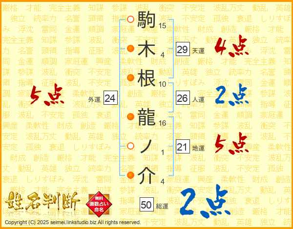 駒(15画)木(4画)根(10画) 龍(16画)ノ(1画)介(4画)