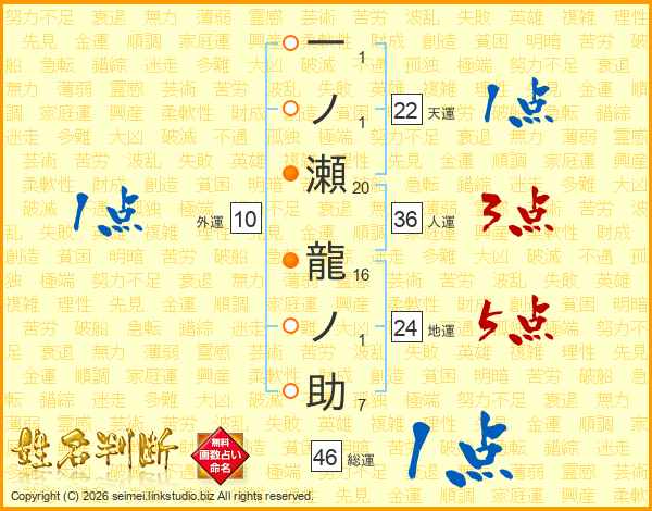 一ノ瀬龍ノ助さんの総運は46画の1点!