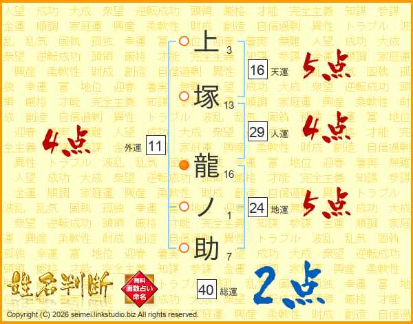 上(3画)塚(13画) 龍(16画)ノ(1画)助(7画)