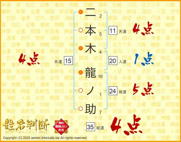 二本木龍ノ助さんの総運は35画の4点!