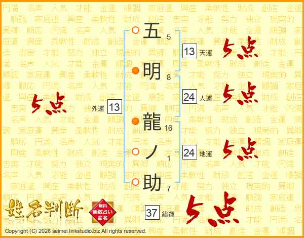 五明龍ノ助さんの総運は37画の5点!