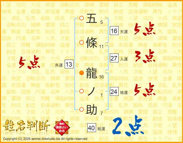 五(5画)條(11画) 龍(16画)ノ(1画)助(7画)
